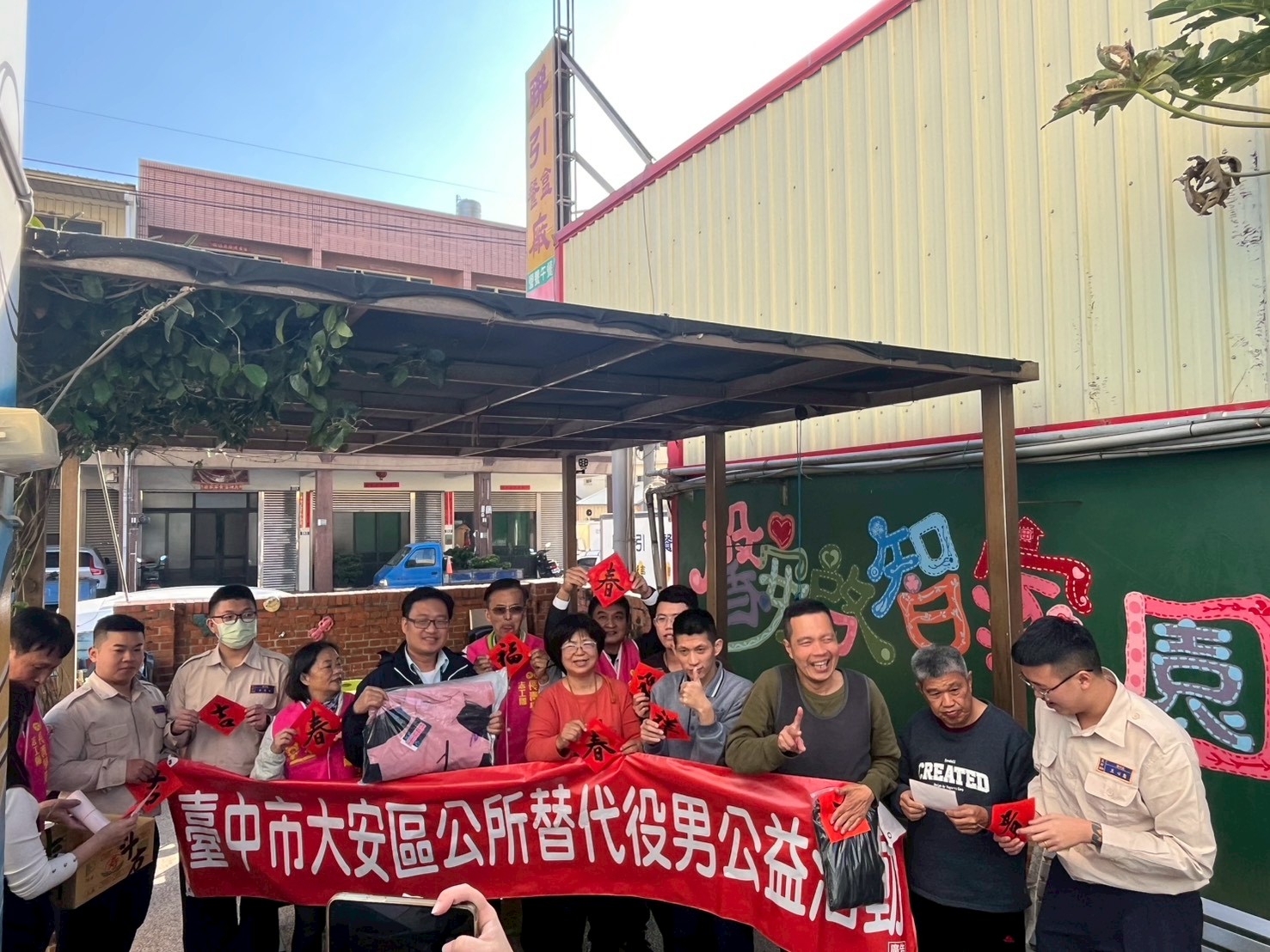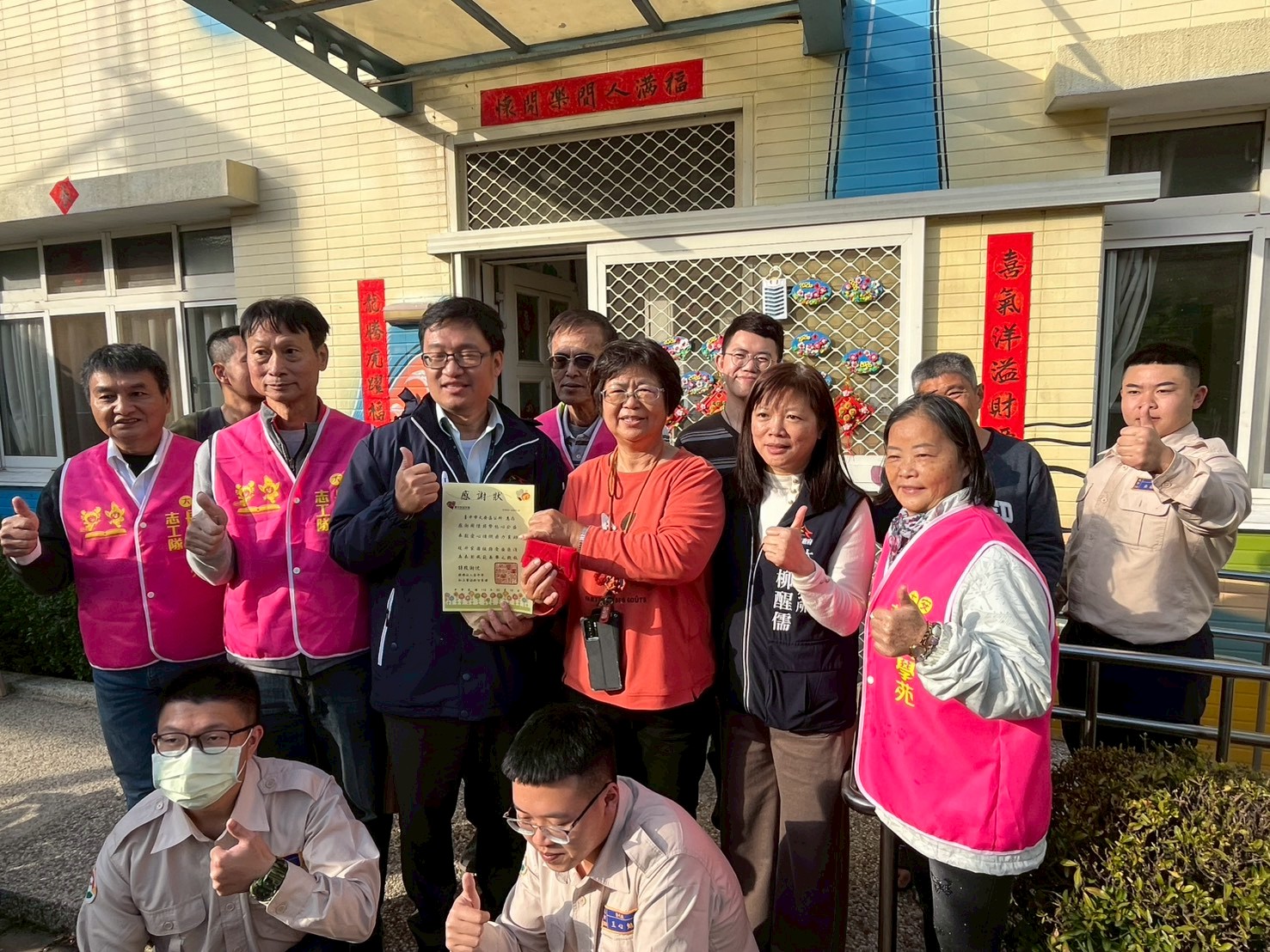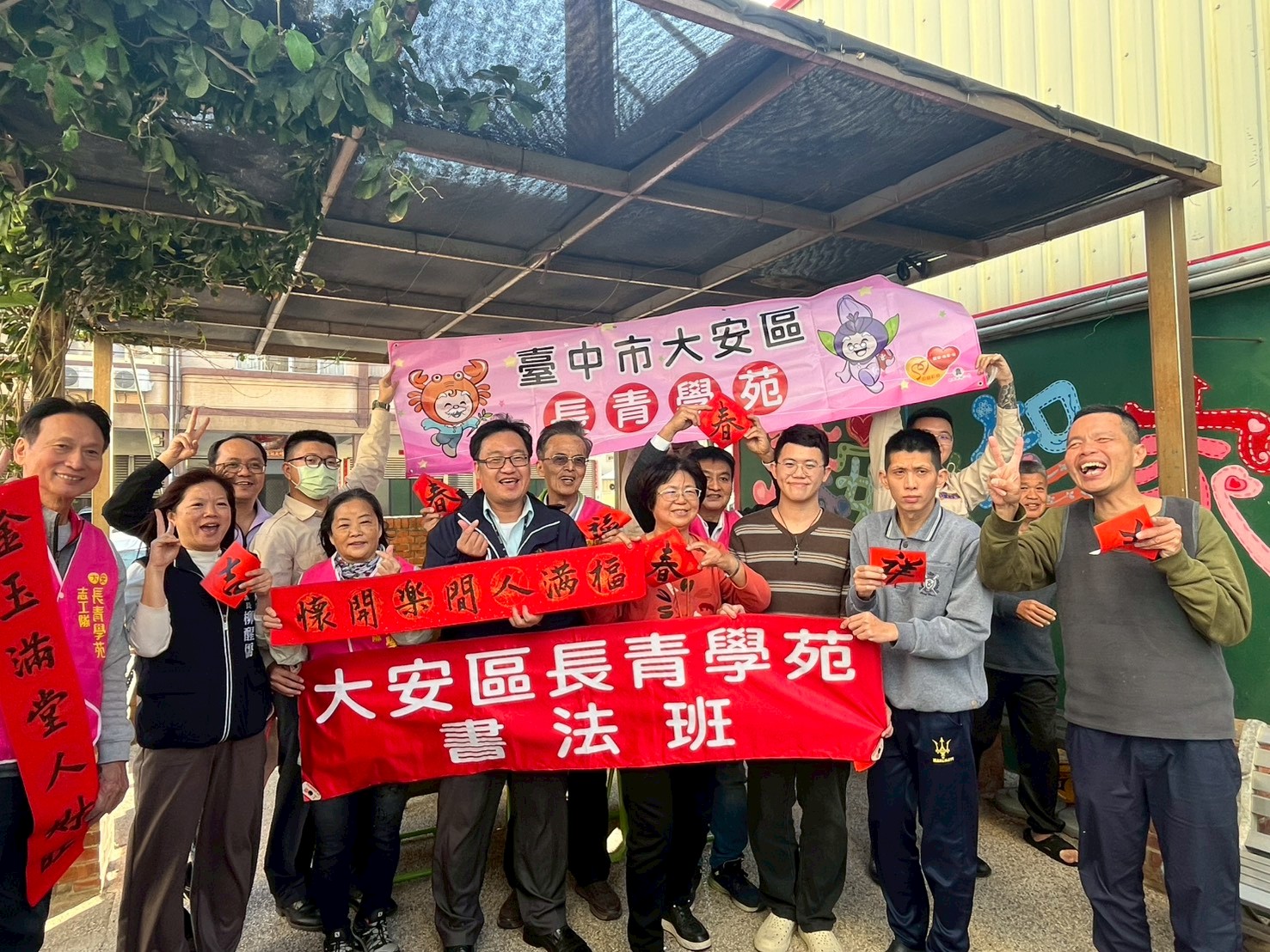 12日在陳明毅主任秘書帶領下,長青學苑志工隊、書法班學員及替代役男們一同前往區內馨安啟智家園,辦理「歲末送暖‧春聯傳情」公益贈春聯活動,以書法藝術傳遞新春祝福與社區關懷。